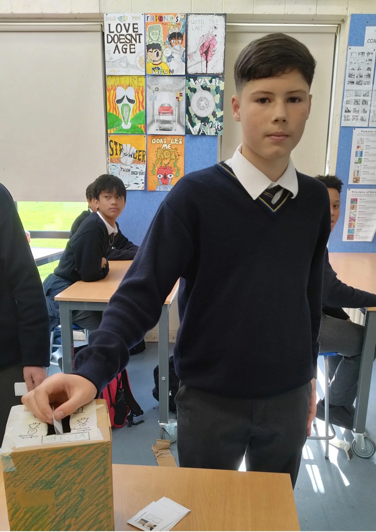 Today Class 2A held their very own Presidential Election during CSPE class. After two convincing and creative campaign presentations from our presidential candidates: Nathan Sukys O’Callaghan (a.k.a. Catherine Connolly) and Max Mercic (a.k.a. Heather Humphreys) it was time for the class to decide who would take up residence in Áras an Uachtaráin for the next seven years!