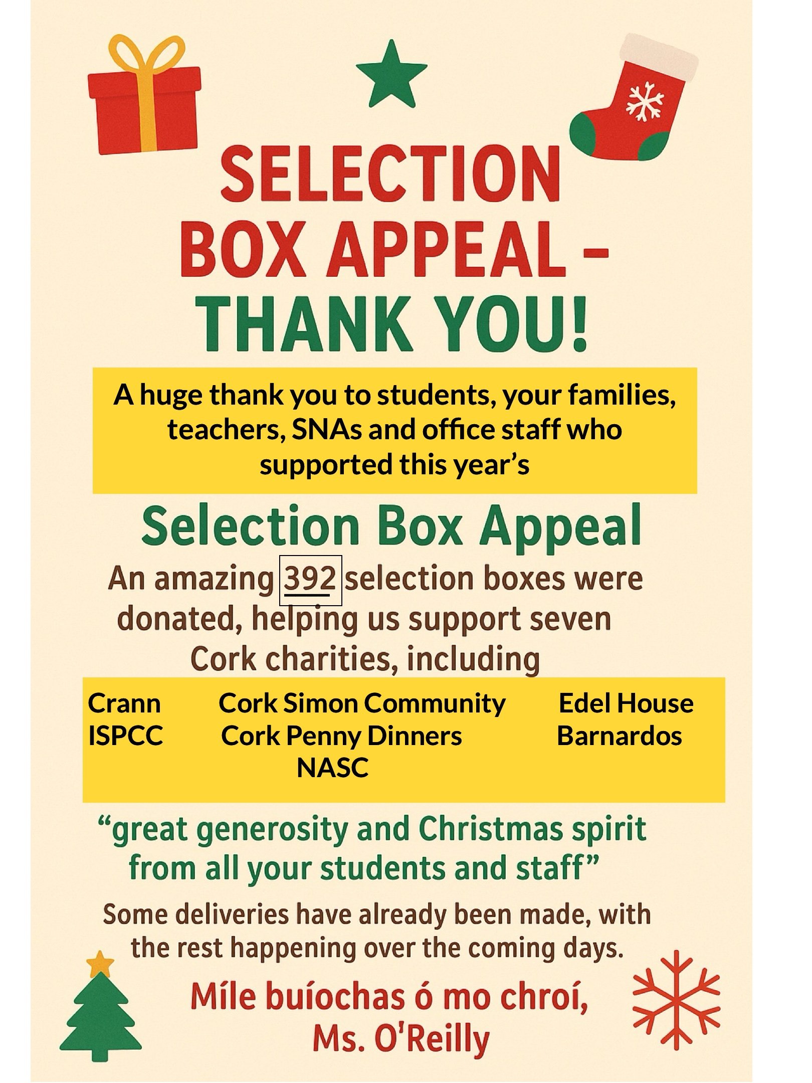 A huge thank you to all students, their families, teachers, SNAs and office staff who supported this year’s Selection Box Appeal. An incredible 392 selection boxes were donated! This has enabled us to support seven Cork charities; Crann, Barnardos Mahon Family Support Centre, Cork Penny Dinners, Cork Simon Community, Nasc, Edel House and the ISPCC.
