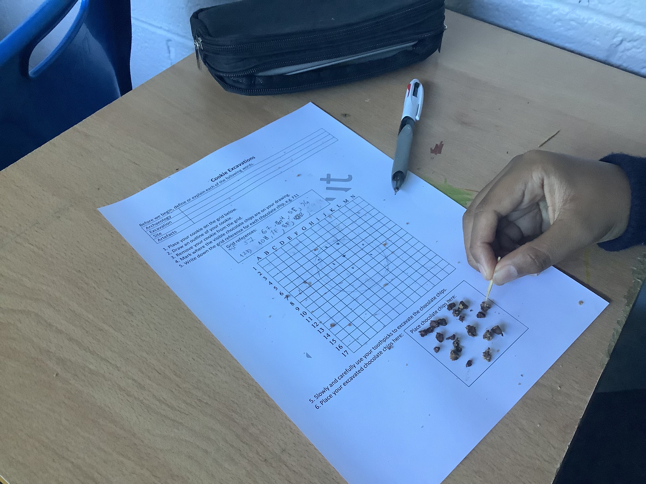 As part of their archaeology studies students took part in a hands-on activity, namely using toothpicks to carefully extract chocolate chips from a cookie! It was a fun way to practice the delicate techniques real archaeologists rely on.