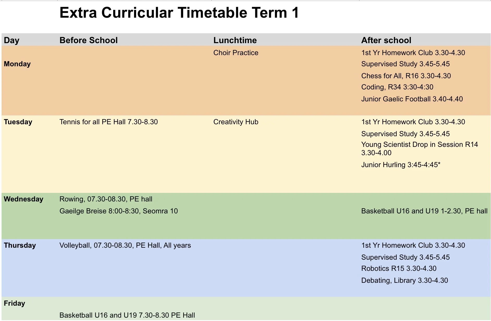 Extra Curricular Timetable Term 1