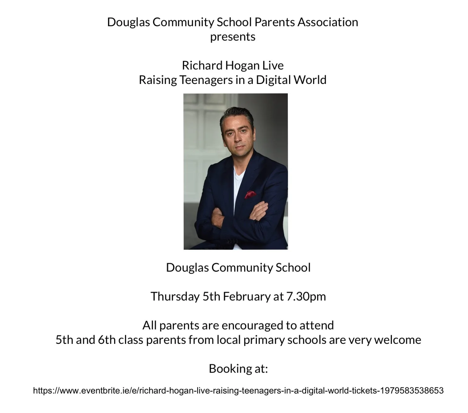 Douglas Community School Parents Association presents a talk by Richard Hogan about Raising Teenagers in a Digital World. It will take place in the school at 7.30pm on Thursday 5th February 2026. All parents are encouraged to attend. 5th and 6th class parents from all local primary schools are also very welcome.