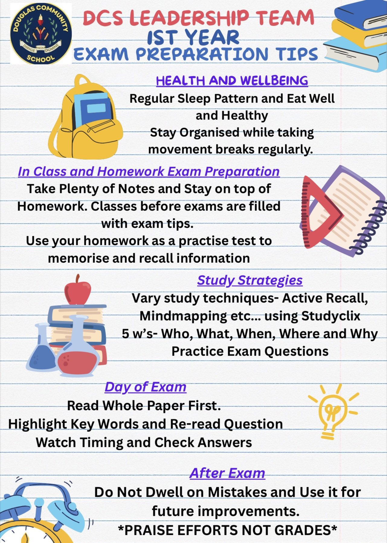 This year the Student Leadership Team introduced a new initiative. They felt they had built up a wealth of knowledge on exam preparation in DCS based on the hints and tips they have learned over their six years in the school. Each leadership team member was paired with one of the five First Year classes and together they compiled a ‘Strategic Study Tips Guide’ during a working lunchtime. They focused on what they believed to be the most effective exam preparation practices. Each member then met with their assigned class and presented the Strategic Study Plan. The Leadership team also provided a copy to every student. The Sixth Year students gave a very comprehensive presentation on the use of Studyclix . They showed the first year students how best to use studyclix for exam preparation. Studyclix has been kindly provided by management for all students in DCS for this academic year.